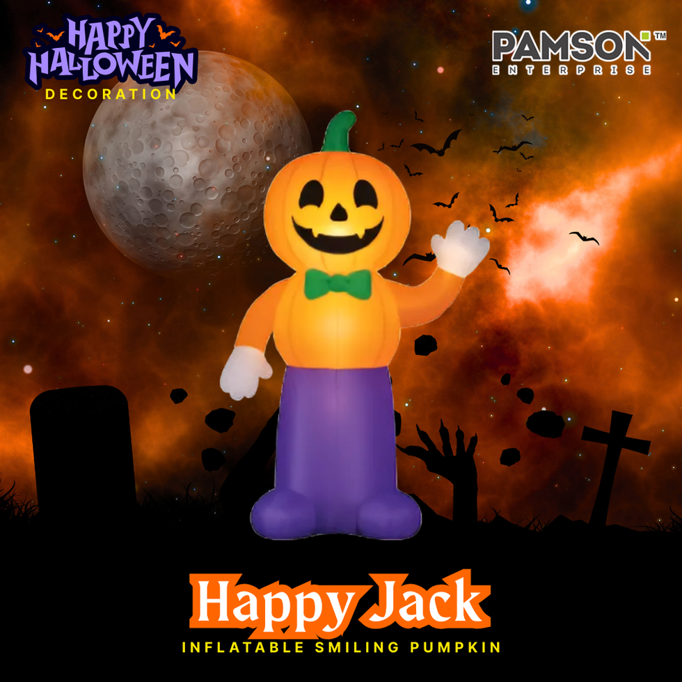 Pamson’s Happy Jack Inflatable Smiling Pumpkin is a cheerful 5-foot decoration that glows with Halloween spirit. With orange charm, green bow tie, and bright pants, it’s ideal for kid-friendly fun. Easy to set up with a waterproof fan and durable design, Happy Jack is a reusable inflatable that brightens up porches and yards year after year.
