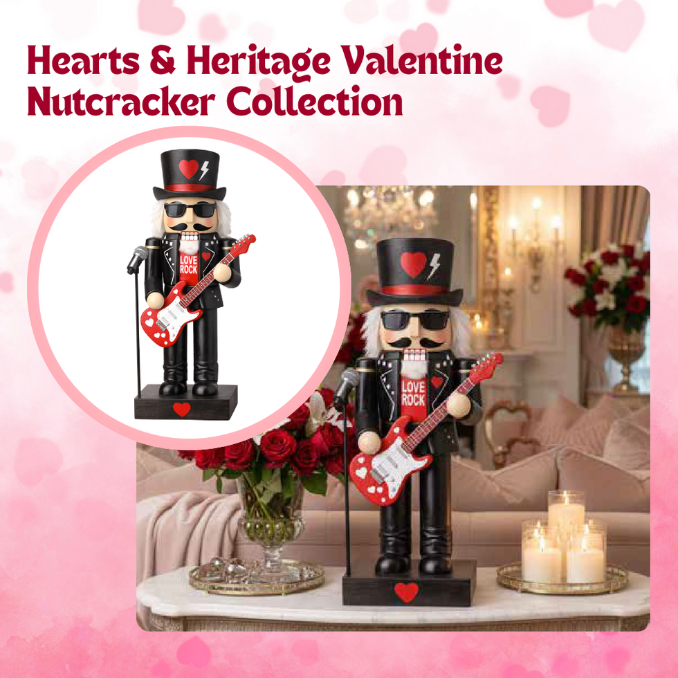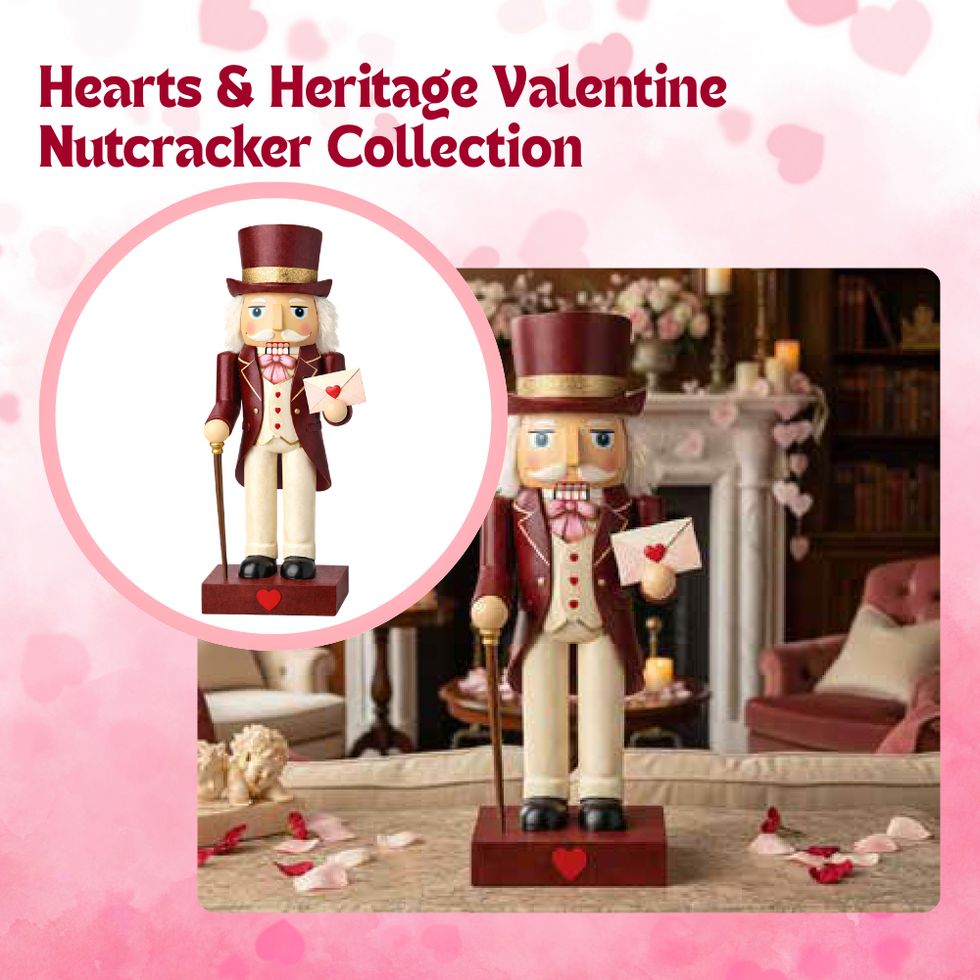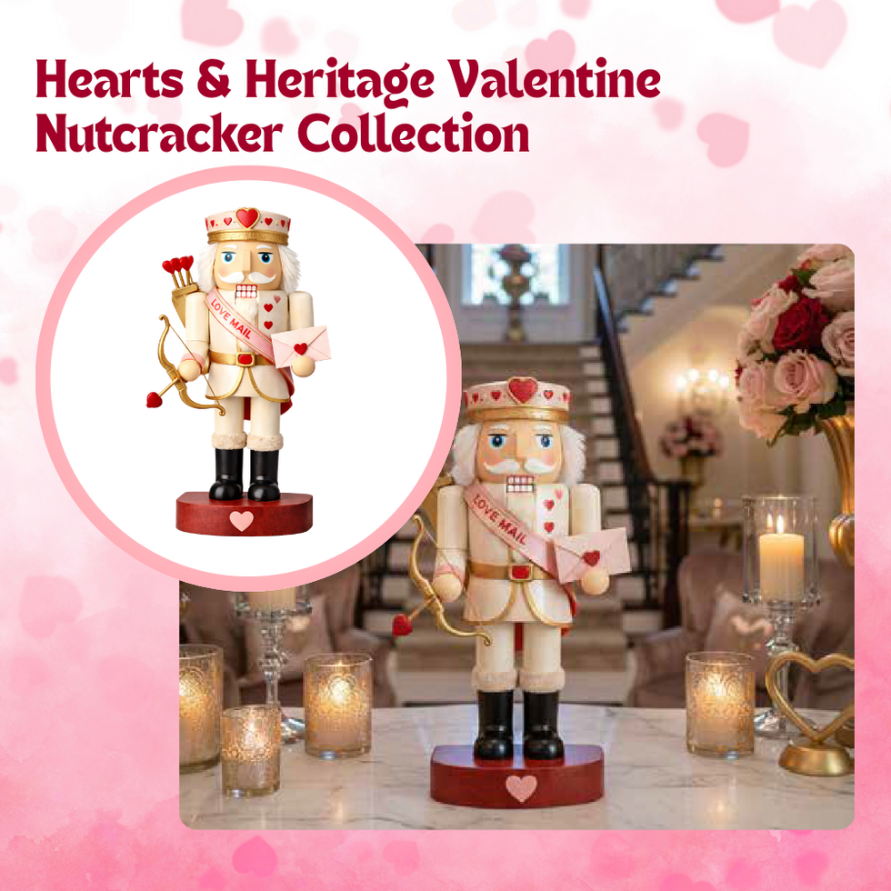 Intricately finished with sculpted details, faux-fur trims, heart motifs, and whimsical accessories, these nutcrackers feel both nostalgic and fresh—perfect as statement tabletop décor, mantels, shelves, or giftable seasonal keepsakes. Displayed individually or together, they form a striking collectible collection that invites customers to mix, match, and build their own Valentine tradition year after year.