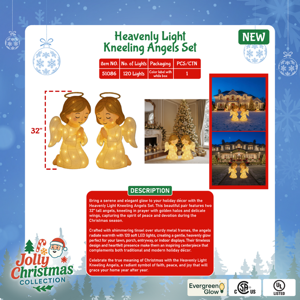 Bring a serene and elegant glow to your holiday décor with the Heavenly Light Kneeling Angels Set. This beautiful pair features two 32" tall angels, kneeling in prayer with golden halos and delicate wings, capturing the spirit of peace and devotion during the Christmas season. Crafted with shimmering tinsel over sturdy metal frames, the angels radiate warmth with 120 soft LED lights, creating a gentle, heavenly glow perfect for your lawn, porch, entryway, or indoor displays. Their timeless design and heartfelt presence make them an inspiring centerpiece that complements both traditional and modern holiday décor. Celebrate the true meaning of Christmas with the Heavenly Light Kneeling Angels, a radiant symbol of faith, peace, and joy that will grace your home year after year.