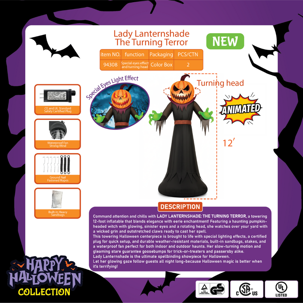 Pamson’s Lady Lanternshade is a 12-foot inflatable pumpkin witch with glowing eyes and rotating head. Combining elegance with eerie motion, it’s designed to chill and thrill. Crafted from durable materials with waterproof fan, this inflatable makes a terrifying yet stylish Halloween display.