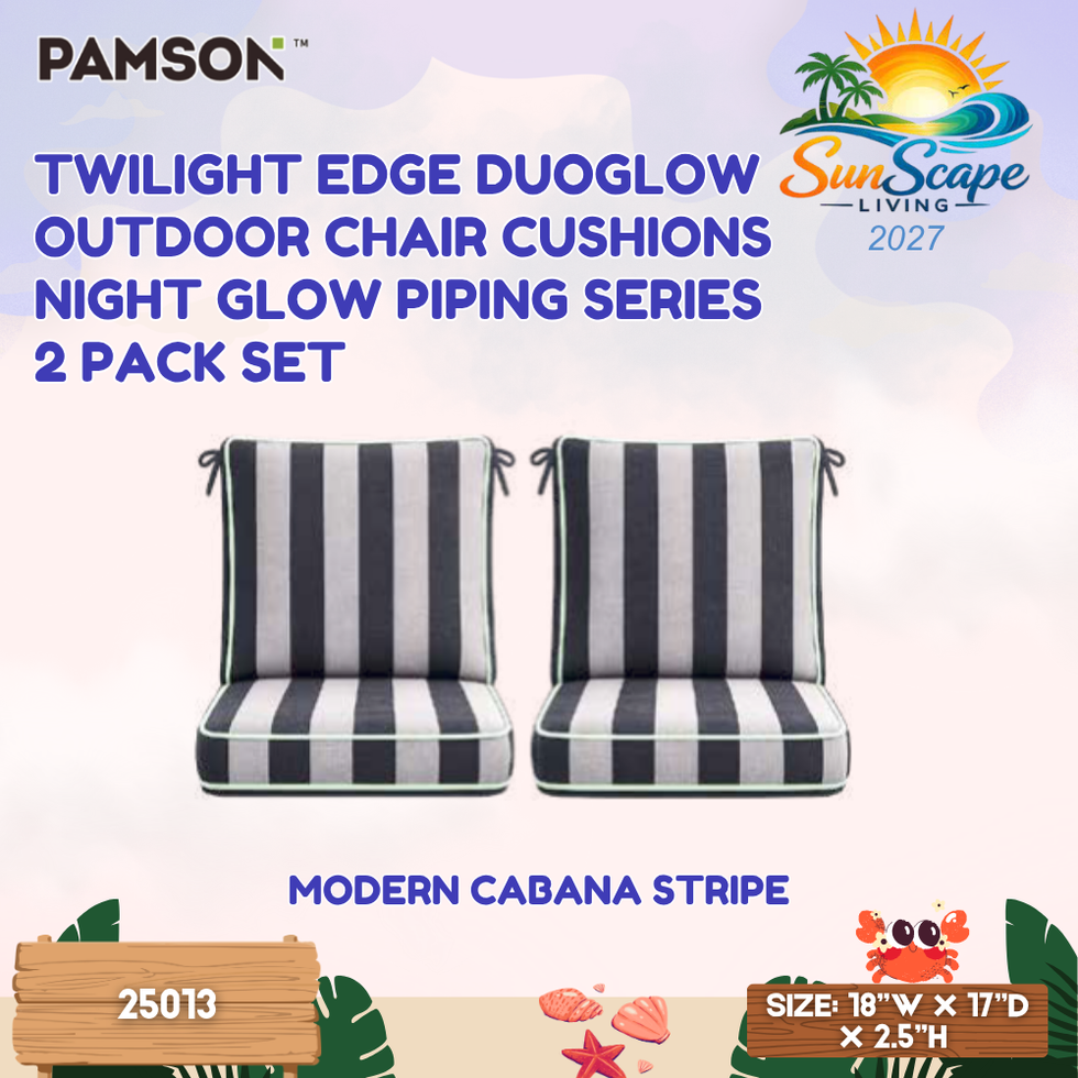 Bring comfort by day and visibility by night to your outdoor living space with the Twilight Edge DuoGlow Chair Cushion Set. Featuring signature Night Glow Piping that softly illuminates after dusk, these cushions add ambiance and enhanced visibility to patios, balconies, gardens and backyard seating areas. Crafted with UV-treated, water-repellent outdoor fabric, they withstand the elements while maintaining rich color and structured comfort.
