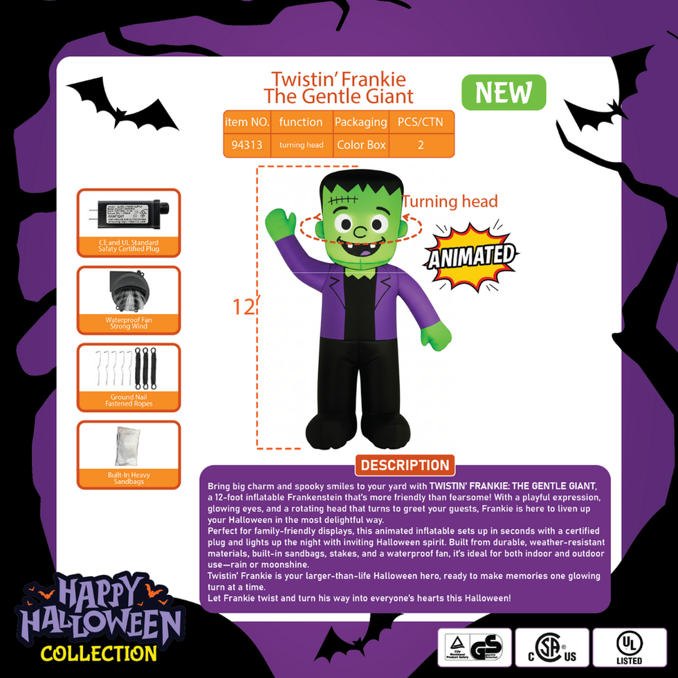 Pamson’s Twistin’ Frankie is a 12-foot inflatable Frankenstein with glowing eyes and rotating head. Friendly and fun, it’s designed for family-friendly Halloween displays. Quick to inflate, reusable, and weatherproof, this gentle giant is perfect for welcoming guests with spooky cheer.